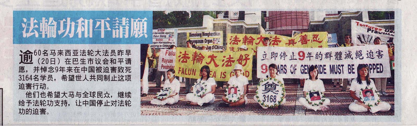 《中国报》在报导中说,法轮功学员呼吁马来西亚和全球的民众,协助法轮功停止在中国这场持续了九年的迫害。