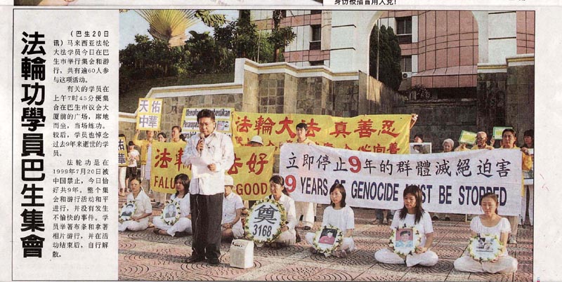 《东方日报》介绍了法轮功学员在巴生市议会前的广场集体炼功,及悼念在中国被迫害致死的学员。