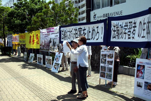 法轮功真相横幅和迫害真相展版吸引了很多车辆和过路行人。一个多小时的宣读声明、发正念、反迫害活动结束以后,学员们离开福冈中领馆前往驻长崎的中领馆。