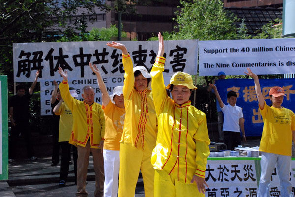 广场上时而有中国大陆旅游团经过,大陆游客停下脚步倾听着高音喇叭的广播,有的还拍下了照片。学员们抓住时机向他们发真相资料,赠送《九评》,并传达全球近四千万勇士退出中共的信息,劝他们尽快脱离中共,退党自救。