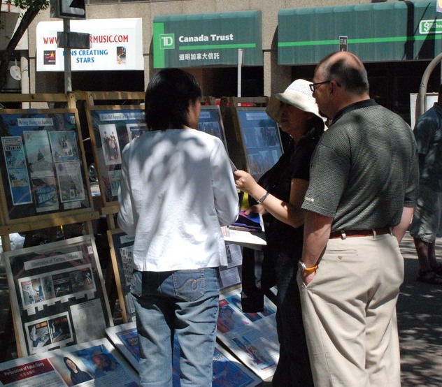 ![]() 民众观看展板了解法轮功受迫害真相 |