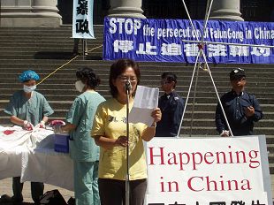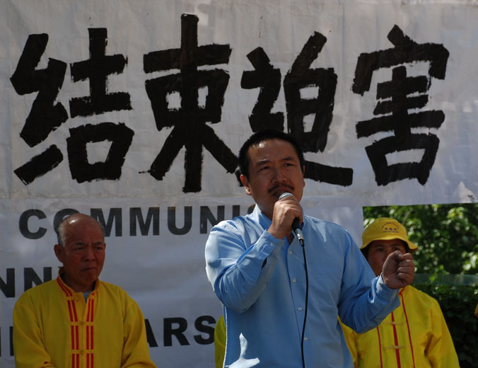 “前苏联异议人士Natan Sharansky,几年前写过一本书,叫做民主案例(The Case for Democracy)。在书中他提到,你是否有一个自由的社会,一个最基本的检验方法就是:你是否敢站在城市里的广场,把你心里的话说出来,而不用担心你是否会被拘捕,或骚扰,或被枪毙,或是坦克从你身上压过去。我们今天在这里讲的迫害的事,在天安门广场上是不允许谈的,在中国公开场合也不允许谈论,所以我们要在这里集会。”