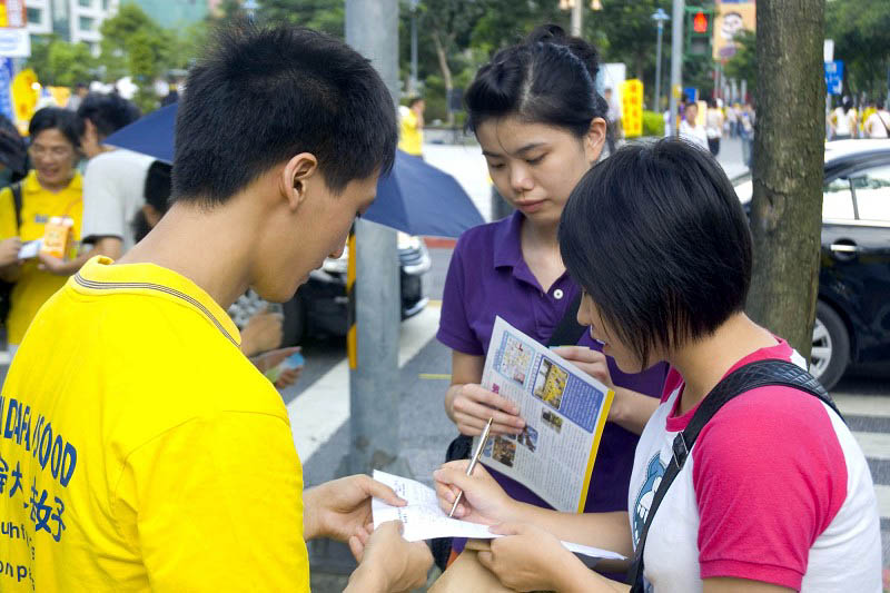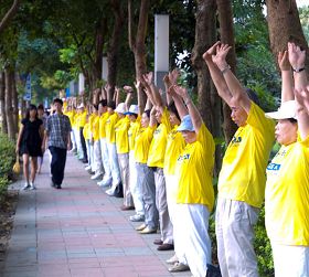 二零零八年七月二十日,一群身着写着“法轮大法好”黄衫的台湾法轮功学员,选在台北最热闹的信义商圈与世贸中心周边街道举办“七·二零”悼念活动,在松寿路、松智路、信义路五段等路段,由千人组成“功法长城”九大方阵,场面壮观浩大,绵延数公里。当炼功音乐响起,顿时将吵闹喧哗的都市带入宁静祥和的氛围,脚步匆忙的市民驻足观看,有的询问如何学炼功法,许多人在“全球反迫害百万签名”板上签名支持。