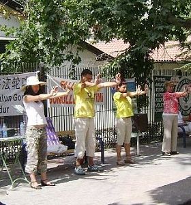 【明慧网二零零八年七月二十五日】二零零八年七月二十四日,土耳其法轮功学员在首都安卡拉市中心使馆区公园里揭露中共