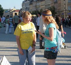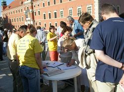 二零零八年七•二零,波兰法轮功学员,有的去华人露天销售大市场与中餐馆广发真相资料;有的去中使馆门前静坐,抗议九年迫害;有的去公园集体炼功;有的来到华沙市老城区,支起展板,广发波兰语《九评共产党》,向过往行人讲述中共邪党九年来对法轮功的迫害。