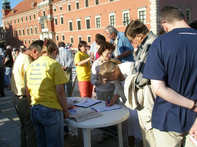 在近三个小时的征签中,有数百名波兰人签名,呼吁在中国奥运前制止中共迫害法轮功。还有很多波兰人询问“这是什么签名?”“请给我们讲一讲,中共这样迫害法轮功,有什么法律依据?”“我要学法轮功,请问在那里能学到?”
