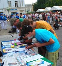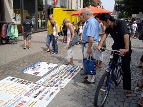 二零零八年七月二十六日,法轮功学员在德国西南重镇奥芬堡的市中心讲真相,呼吁制止中共迫害。