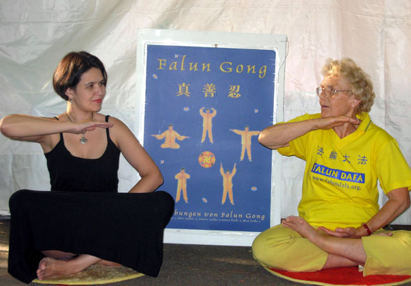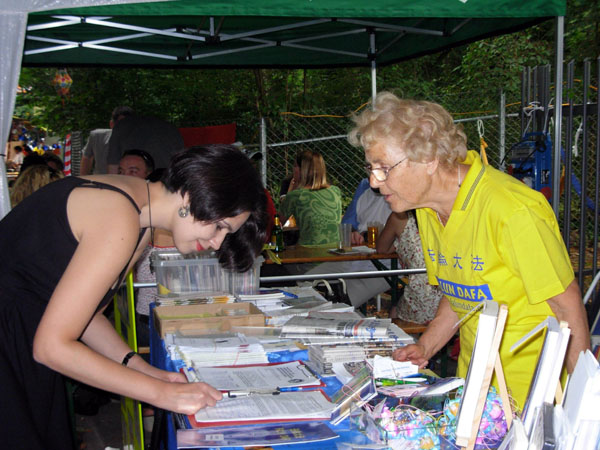 法轮功学员在伯尔尼亚洲节上的摊位吸引了很多人,还有不少人询问什么地方可以学炼法轮功。就连对面摊位忙碌的摊主也过来索取炼功点的信息,她表示看了法轮功学员炼功,觉的心里非常舒服,所以也想学炼。