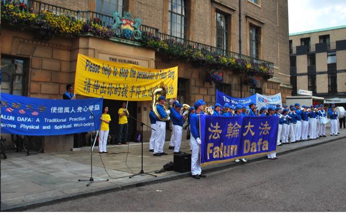 集会由英国法轮大法学会和英国退党大联盟共同主办。在集会现场,欧洲天国乐团的队伍整齐排列在会场中央,其他学员们打着横幅和标语牌站立在背后和两侧,横幅上面用中英文醒目的写着:“世界需要真善忍”、“法轮大法使亿万人身心受益”。