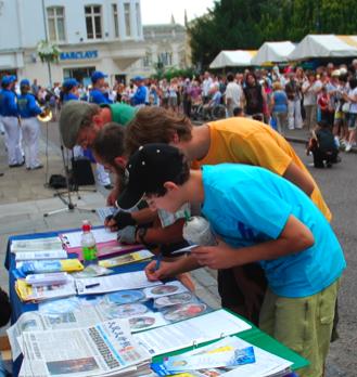 在真相资料展台前,一个中年白人男子突然激动的喊叫起来,脸上现出痛苦的表情,一边叫一边手指着真相展板上恶警挥向法轮功修炼者的狼牙棒,原来他是个哑巴,被中共迫害法轮功真相所震惊,招呼他的同伴过来看。他的同伴过来了,立即在反迫害征签表上签名。这时那个男子又在旁边发现了法轮功学员遭受 还是在真相资料展台前,又一个中学生模样的西人男孩,正准备在征签表上签名,一个看起来像参加夏令营刚从中国大陆出来的中国女孩儿突然从旁边走过来,对西人男孩儿说“这不是真的”。只见西人男孩儿展开捏在手中的真相传单,对着封面上法轮功学员被迫害的图片表情凝重的看了看,缓慢而坚定的对中国女孩说:“我相信这是真的”。