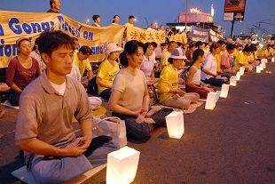 二零零八年七月三十日晚六点,法轮功学员在纽约中领馆前静坐抗议,强烈谴责中共以奥运为借口,加剧迫害法轮功。