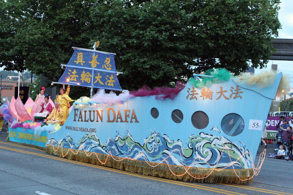 乘风破浪,载度众生,“法轮大法法船”再一次在西雅图市中心航行。“大法船”长四十五英尺,是海洋节“炬光”大游行中最雄伟的花车。天蓝色的船身衬托出金光闪闪的“法轮大法”中英文字体。“大法船”上展示着如同天国世界一般的仙境。大大小小的莲花、荷叶飘逸在彩色祥云间,七位男女老少、华人、西人身着高雅的唐装、传统服装展示法轮功五套功法,象征着世界各族裔、各年龄层的人们修炼大法。“大法船”是那么的不同寻常,所到之处,人们或仰目惊叹,或鼓掌欢呼,或模仿“法船”上学员炼功、合十的动作,或静静的微笑挥手致意。“大法船”一路前行,带给人们希望、美好和向往。