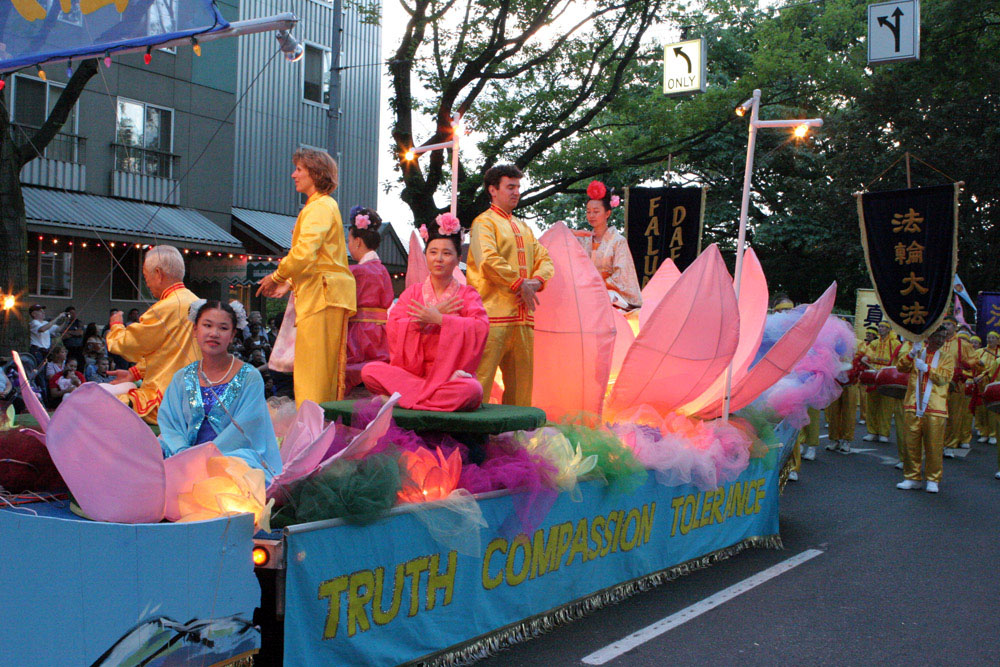 首先出现在人们眼前的是“法轮大法”金字大横幅。四位女学员如同天上下凡的天使们,手持横幅,笑容可掬,飘逸出场。她们向观众频频招手 - “法轮大法来到了!”常常有观众跑上前来与仙女着装的学员合影留念。