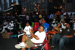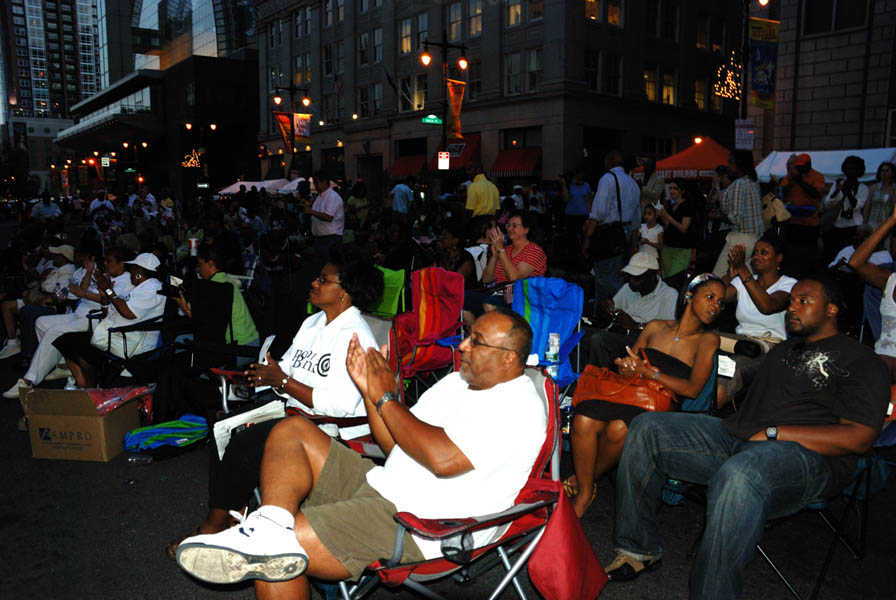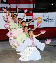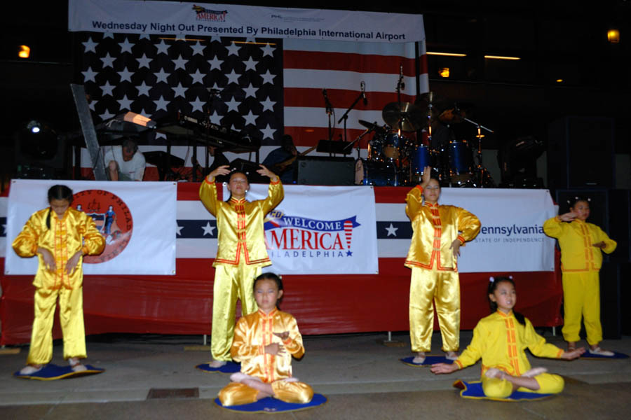 “星期三晚上出来玩”由费城国际机场赞助,邀请到了很多费城有才能的艺术家、演员、音乐家上台表演。很多人自己带椅子来欣赏。晚八点半,大费城明慧中文学校六位大法小弟子表演了四个舞蹈:插莲花、彩带舞、莲花舞、腰鼓,和法轮功五套功法演示。