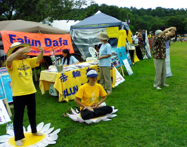 法轮功学员布置了很多展板和各种各样的真相资料,播放《普度》、《济世》音乐,等待有缘人来了解大法。一位老者很快就被音乐吸引过来了,他说这音乐很特别,在这么嘈杂的场所,离着很远他就能分辨出这个音乐,他非常坚决的表示一定要买这个光盘。到第四天结束时,学员们准备的音乐光盘和所有的英文资料全部被有缘人拿走了,平均每天都有数十人询问在哪里可以学炼功。