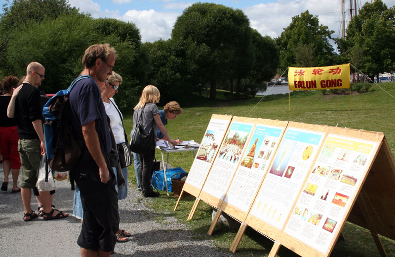 和往常一样,今天的活动照样吸引了很多的瑞典民众和来自世界各地的游客。人们一批批的从这里走过,他们有的默默的站在真相展板前观看,认真的阅读展板上的图片介绍,有的在静静观看学员演示法轮功五套功法,全然不顾烈日骄阳。