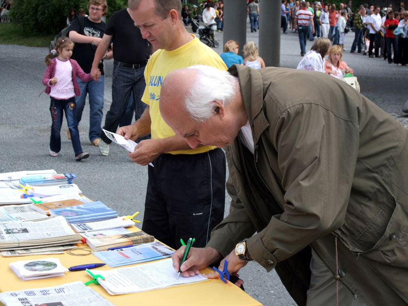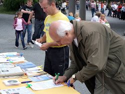 一位来自欧洲一个小国家的白发老人,英语不是很好。他很仔细的看完了展板,而且还观看了学员演示的五套功法。他对法轮功很感兴趣,不但签下了自己的名字表示支持,而且还详细的打听了有关法轮功网站的所有信息。等学员炼完五套功法以后他才满意的离开。