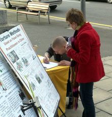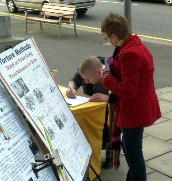 ![]() 路人在制止中共迫害法轮功的征签表上签名 |