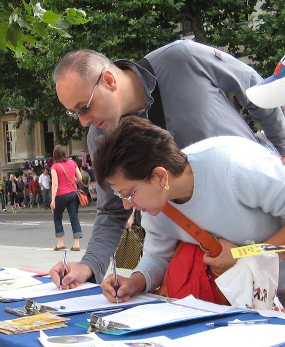 记者发现法轮功学员的真相展示也吸引了一些华人的关注。一对家住伦敦的泰国夫妇对法轮功学员的功法展示观看很久,记者上前询问后发现其中的丈夫是华人,会说普通话,而同样东方面孔的太太是泰国人,只会说英语。这位太太随即急迫的向记者询问在哪里可以学法轮功,而丈夫更急于知道怎样才能得到法轮功的书。当被告知伦敦摄政公园周末义务教功点的信息以及可以上网查到所有法轮功的著作后,夫妇二人显的非常高兴。接着,泰国妻子向记者表示她对这样平和的功法受到中共迫害不能理解、不能接受,而华人丈夫则在反迫害征签表上签了名。