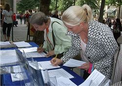 许多人看到 “在奥运会前欧洲卫星公司关掉了独立媒体新唐人电视台对中国的播出”的横幅,非常关注,了解了情况后,马上签名声援新唐人。