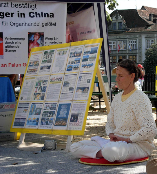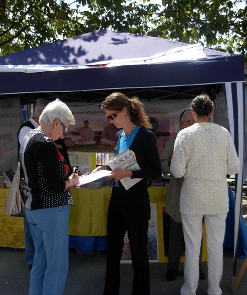 法轮功学员常常在卢塞恩办类似的信息日,有不少路人表示,自己已经了解法轮功,或者已经签过名呼吁制止中共迫害。但还是有人第一次听说法轮功。一位高高瘦瘦的中学老师就是在这次的信息摊位上知道法轮功的。