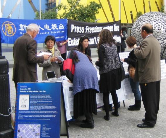 两个多小时的集会活动,约两千五百位澳洲当地市民及游客接受了新唐人的传单,很多人主动前来签名声援新唐人,还有人要直接给欧卫公司总裁写信,敦促欧卫恢复新唐人对中国大陆的播放。