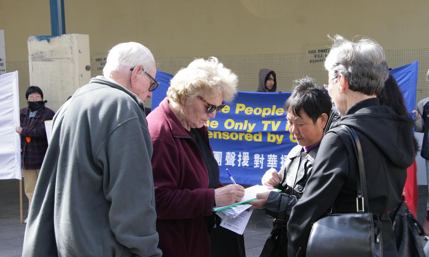 集会现场的大幅标语“欧卫勿做中共帮凶,立即恢复新唐人信号”;“抗议中共封锁独立媒体,剥夺国人知情权”、“澳洲社团声援新唐人电视台对华播出”清晰醒目,引起当地民众对欧卫事件的关注。