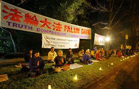 二零零八年八月四日晚七点三十分,澳洲墨尔本法轮功学员来到中领馆前烛光守夜,悼念被中共迫害致死的中国大陆同修,同时在距北京奥运开幕四天之际,呼吁全世界,特别是前往北京的国外记者,按照法轮功受迫害真相调查团提供的资料地图,借奥运之机,关注正在遭受非法监禁的法轮功学员的境况。