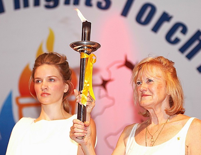 ![]() 澳洲人权圣火传递大使简•贝科女士(右)和“正义女神”共同高举火炬 |