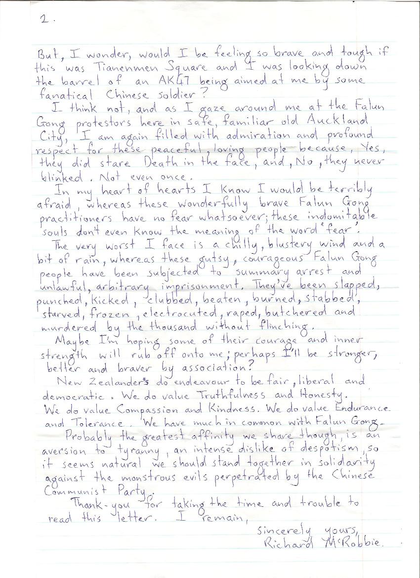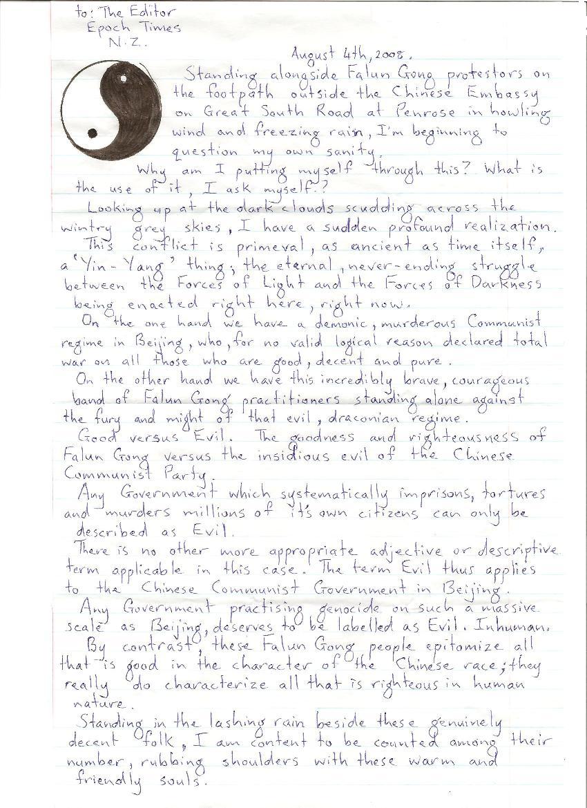在大雨中和这些真正纯洁的人们站在一起,我很欣慰可以跟这些正义的灵魂在一起。但是,我想,如果这是在北京天安门被拿着AK47的士兵瞄准着,我还会如此勇敢么?我不认为我做得到。我看了一下周围这些法轮功学员,在这熟悉安全的奥克兰,我又一次心生敬佩。他们面对这死亡是连眼都不会眨一下,而我知道,如果是我,我会非常害怕。而这些法轮功学员却没有任何恐惧,他们并不知道恐惧。我面对的最差不过就是刺骨的寒风、大雨,而这些勇敢的法轮功学员,他们(在中国)面对的是非法的禁锢,他们被踢、打、烧、刺伤,忍受饥饿、冻伤、电棍、强奸、谋杀。新西兰很努力做到平等、公正、民主。我们重视真诚和诚信,我们重视善良和爱心,我们重视忍让和宽容,我们和法轮功有很多相同之处。