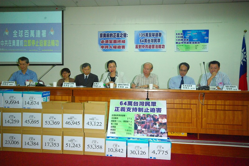 ![]() CIPFG亚洲分团公布台湾六十五万人联署资料,呼吁制止中共迫害法轮功。与会人士由左至右:台湾营救受迫害法轮功学员协会理事长明居正、台湾人权促进会秘书长蔡季勋、法轮大法学会理事长张清溪、CIPFG成员、台湾立法委员田秋堇、国际特赦组织台湾总会理事长李胜雄律师、民间司法改革基金会执行长林峰正、前总统府人权咨询委员会委员廖福特。 |