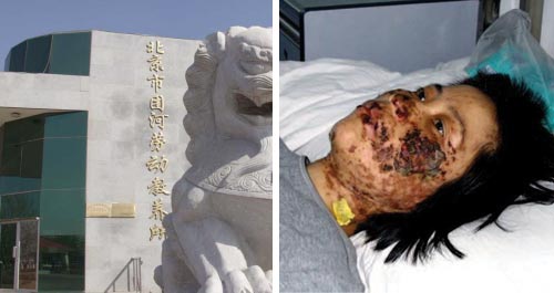 ![]() 中国装饰的劳教所外表掩盖着内里的恐怖。左面是团河劳动教养所,右面是法轮功学员高蓉蓉在马三家劳教所被迫害致死之前被毁容。 |