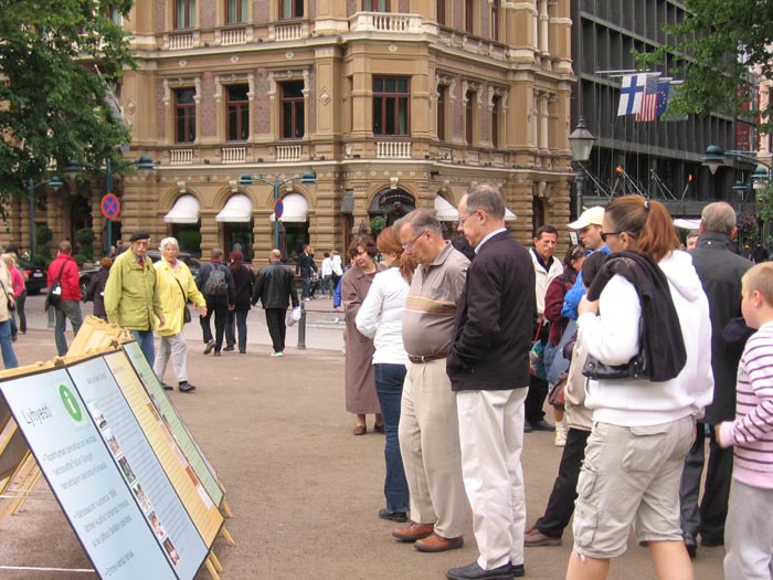 夏季的尾声,芬兰旅游的游客依旧络绎不绝。来自世界各国的人们都来到了这个小小的海滨大道公园里,品味着芬兰的文化。有来自瑞典的家庭,有来自美国的年老夫妇,也有来自欧洲的旅人,其中很多被在公园一角的法轮功学员所吸引,停下脚步聆听学员用英文和芬兰文轮番借助喇叭向游人讲述什么是法轮功、及中共对法轮功的迫害、呼吁共同制止迫害,阅读展板,索取资料,走到签名桌前签名声援。