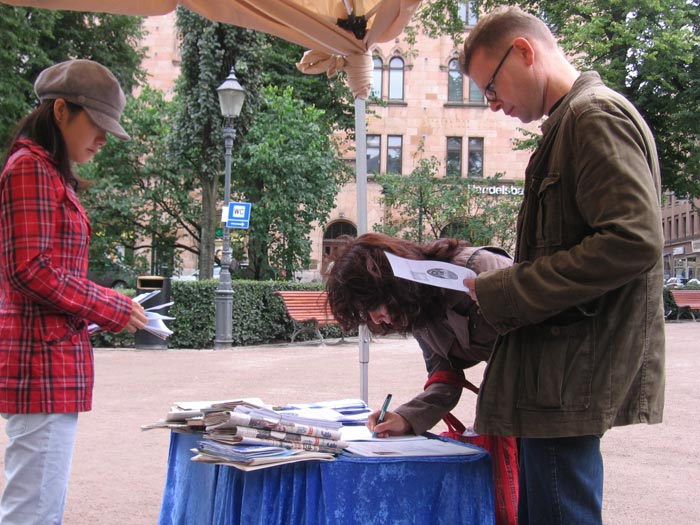 来自瑞典小城Väljö的白尔洁(Birjilh)女士主动的找到学员索要资料,并签名声援停止迫害。她说:“我是从我们那的广播里听到法轮功的”,并希望能够多了解一些。又有一位男士,询问学员有没有更多的瑞典语资料。在拿到了瑞典语版的大纪元报纸和《九评共产党》后很高兴的离开了。