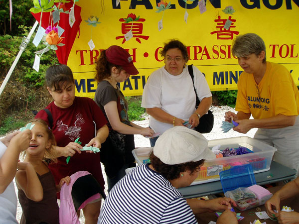 当日,暴风雨前断断续续的细雨天气并未阻挡游人的热情,法轮功展位前,游人如织。一位大陆来的中年女士,被漂亮的莲花吸引到摊位前,很认真的学折叠莲花,学员对身边的西人说,“莲花代表着什么?”她马上接过话题,“我是从中国大陆来的教师,在中国,莲花代表着纯洁,出污泥而不染。”当得知莲花在法轮功学员心中,有更深寓意时,她突然意识到她来到了法轮功的展位前,吃惊的说不出话来。学员柔和耐心的把真相解释给她,请她记住“法轮大法好,真、善、忍好”,讲为什么要退出中共邪党的原因,她一直默默的听着,最后,这位女士眼含感激一再致谢,手捧莲花离开展位。