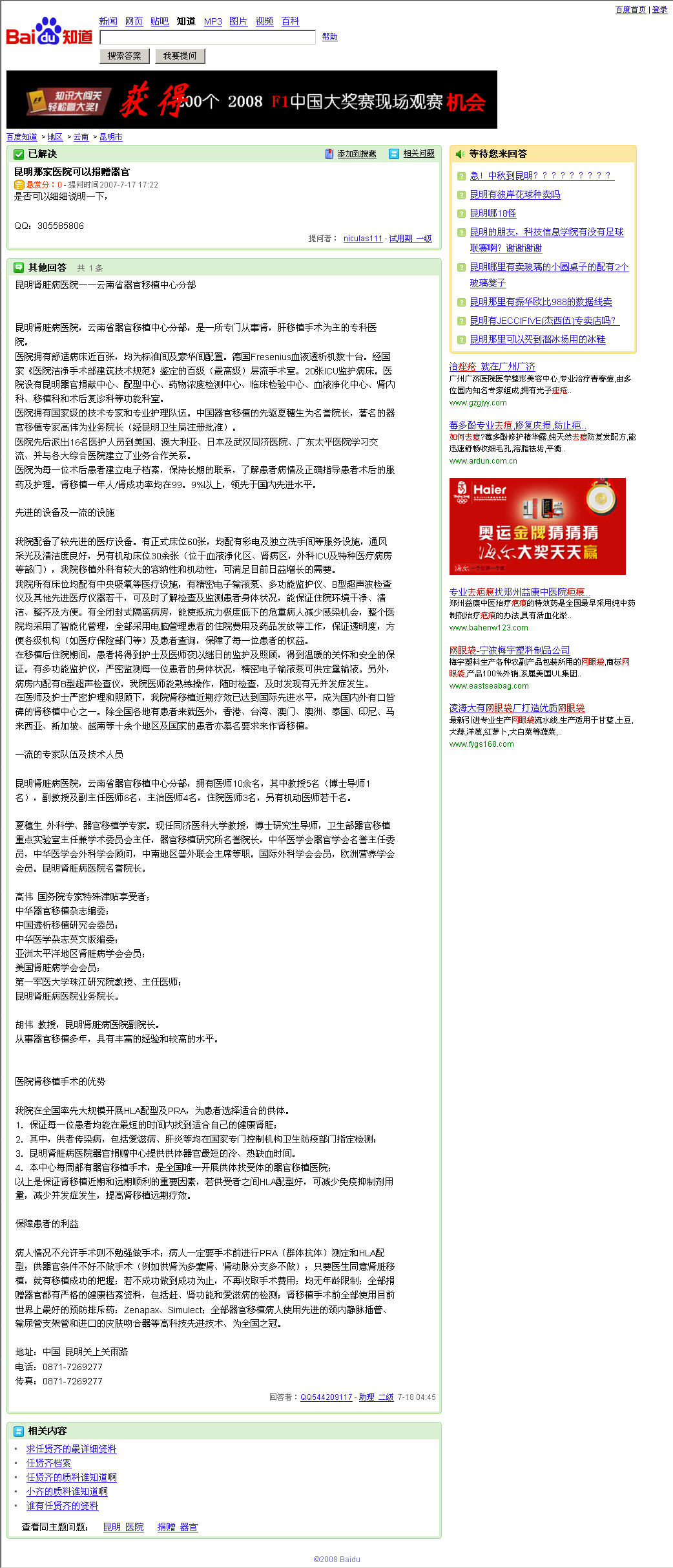 我有一个朋友得了肾病。2008年7月份,包括我朋友在内的四个这样的病人同时在北戴河281医院做了肾移植。肾脏的来源不明。目前,通过114,281医院总机已经不能查询,说是做了保密。
