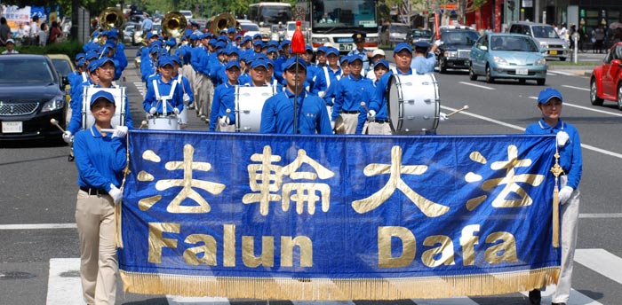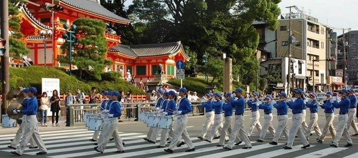 由近百名法轮功学员组成的天国乐团也参加了游行,这是天国乐团首次在大阪和京都亮相,精彩演奏吸引了大量行人驻足观望;观众们赞声不绝。