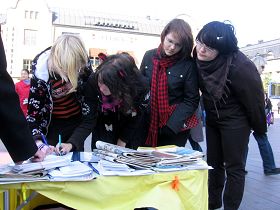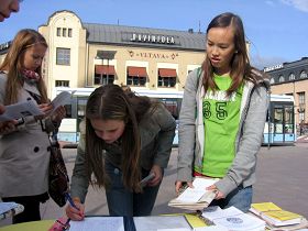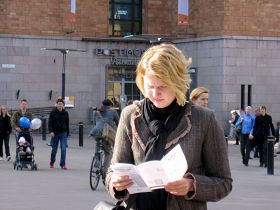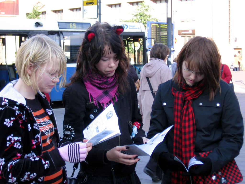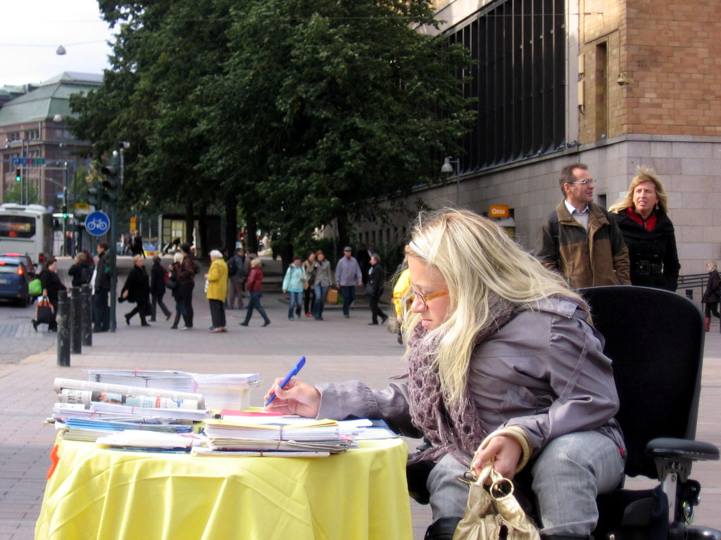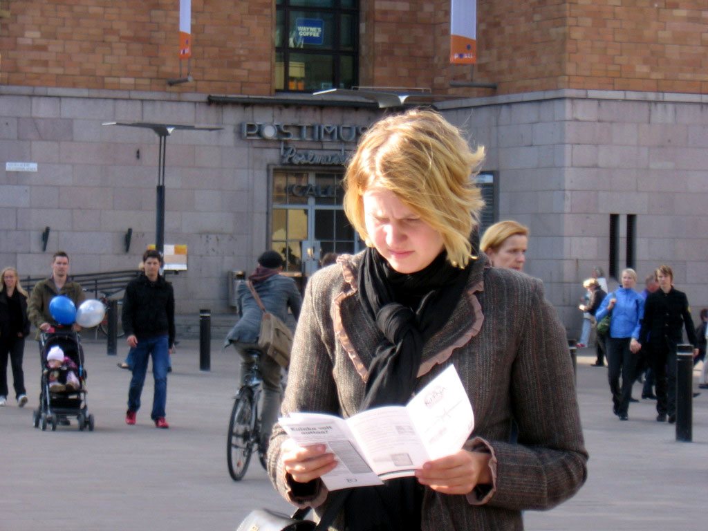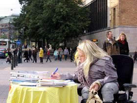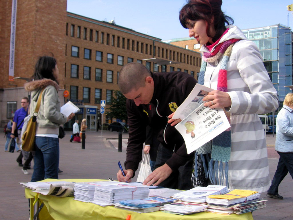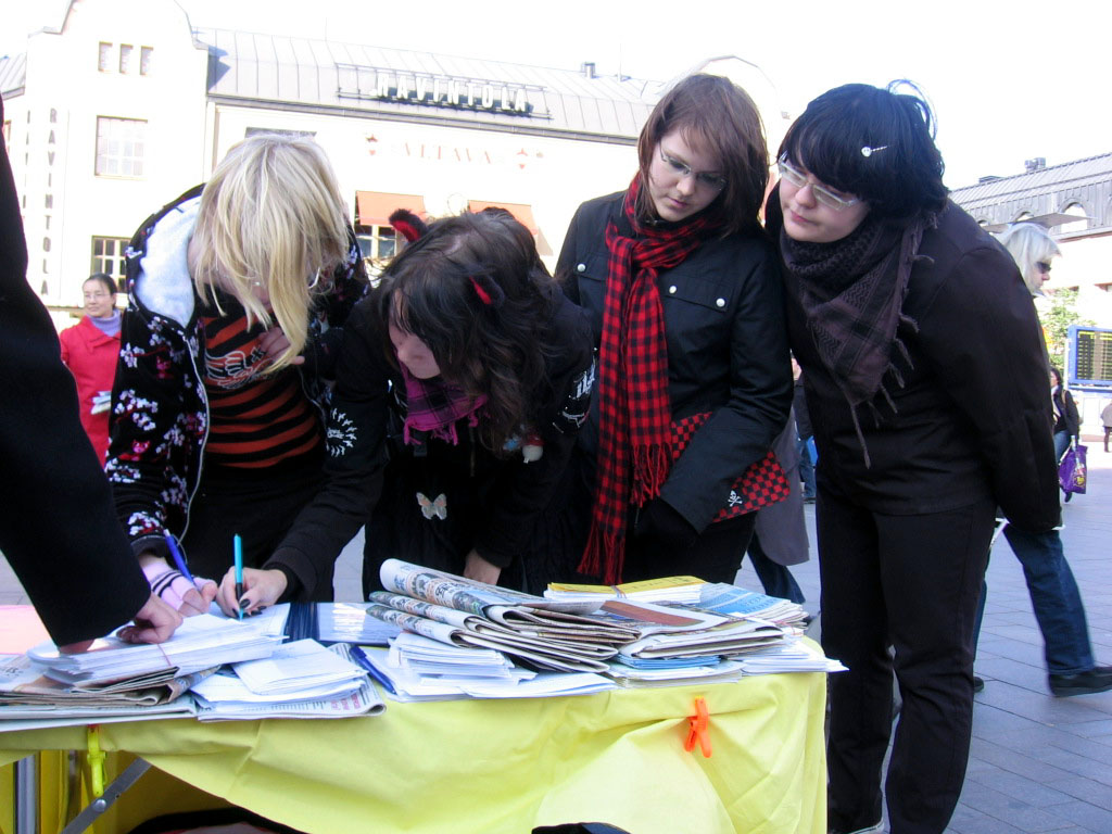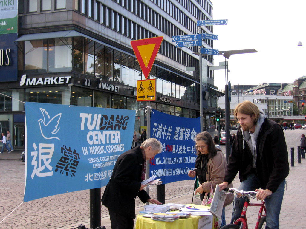 一位芬兰女士在征签桌前转了好久,最后对Anija说,她有一个亲戚是位中共的官员,所以她不敢签名,但她要了九评和法轮功被迫害的传单及英文的《九评共产党》报纸。