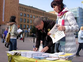 Petri是位学生,他说他喜欢历史,他欣然接受了英文的《九评共产党》报纸和法轮功的英文真相光碟,然后签名声援。