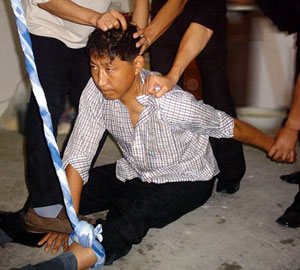 最后我被按到了铁桌下,他们先把我的腿水平固定在地面上,大约四个人勉强按住我的脚(双腿成30度角),使我不能动。剩下的几个人把我的脖子绑在两个小腿肚上,然后开始往下压我后背。我是个大块头,身材又高又胖,当时体重有90公斤,肚子大。平时坐着最多也只能保持上身与下身成90度角。而此时却把我的上身压平与下身成0度角,肚子被压错位挤到两侧,脖子与脚踝骨成一条直线。然后用床单把我的脖子和脚一起固定住,这使我上身不能抬起一点。这时我的面部和腹部同时触到地面,而后又把我双手反绑。