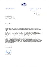 2008年8月25日,澳大利亚外交部长斯蒂芬•史米斯致信法轮功学员张而平,表达了澳大利亚政府对法轮功在中国所受到的迫害的关注,并表示会通过外交渠道向中国政府提出他们的关注。