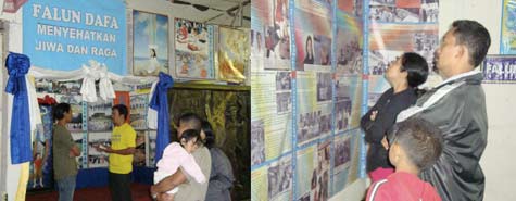 ![]() 展位上的法轮功功法演示 |