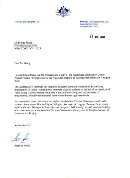 我感谢你在2008年8月7日在澳大利亚国际事务研究所会议给我的一份法轮大法信息中心的刊物《慈悲》。