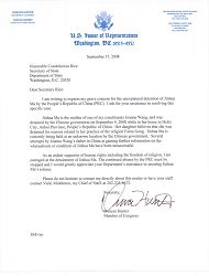 美资深国会议员邓肯·亨特二零零八年九月十七日致信国务卿康多丽莎·莱斯,呼吁营救正被中共非法关押的法轮功学员马金花。