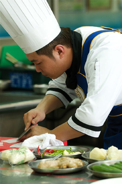 ![]() 选手大厨们认真备料比赛 |