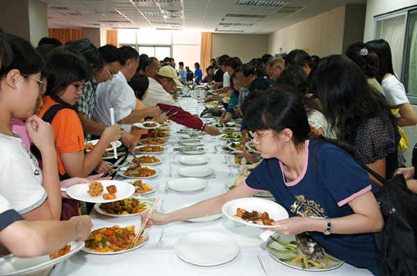 ![]() 中国菜厨技大赛首先登场的是粤菜系列,现场观众争相品尝。 |