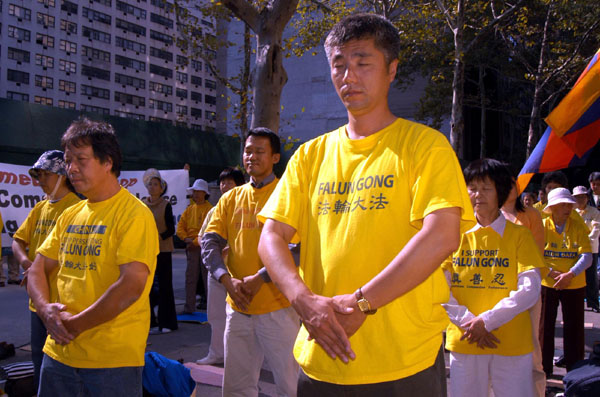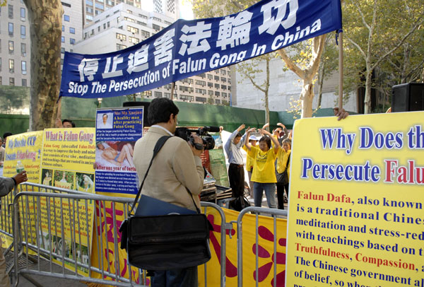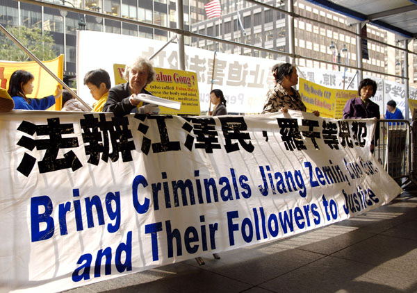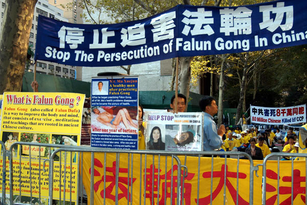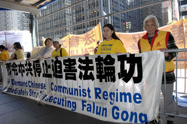 ![]() 法轮功在联合国前,以及温家宝下榻的沃道夫旅馆前集会,要求结束迫害。 |