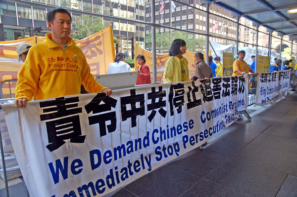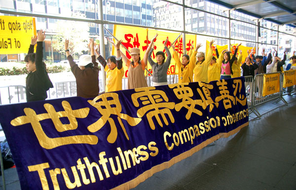 在联合国峰会期间,法轮功学员和平的反中共迫害的活动,获得附近警民的支援。