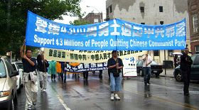【明慧网二零零八年九月二十九日】(明慧记者采菊纽约报道)二零零八年九月二十八日上午, 来自大纽约地区的各界人士在纽约布碌仑区中国城游行集会,声援四千三百万勇士退出中共,告别毒源,希望布碌仑的父老乡亲认清中共邪党的本质,互相转告,早日退出共产党、共青团和少先队,走向光明。