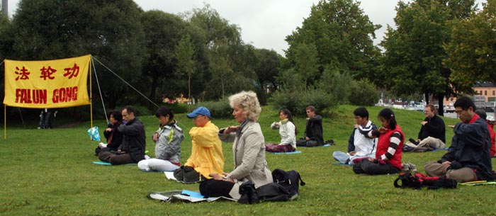 ![]() 法轮功学员在瓦萨沉船博物馆旁的草地上炼法轮功第五套功法 |